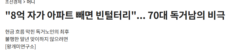 8억의 아파트가 있지만 그야말로 평가 자산일 뿐 나에게 들어오는 현금이 없어 궁핍하게 살다가 안타까운 결말을 맞이했다는 내용이다.