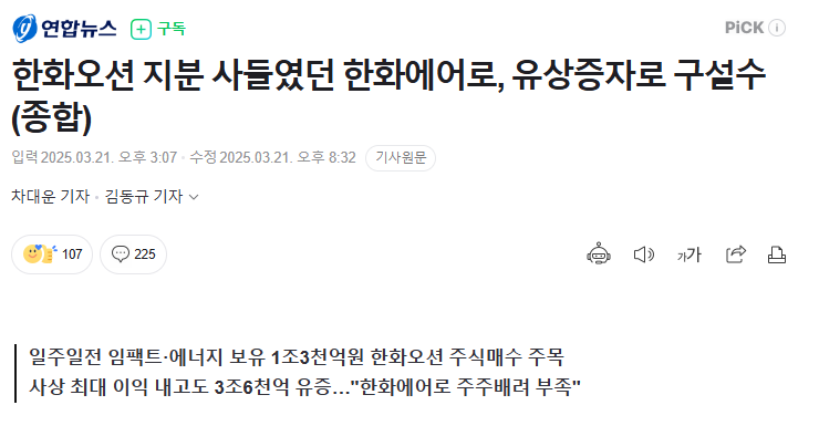 일주일전 임팩트·에너지 보유 1조3천억원 한화오션 주식매수 주목 사상 최대 이익 내고도 3조6천억 유증…"한화에어로 주주배려 부족" 차대운 김동규 기자 = 방산 호황기를 맞아 작년 1조7천억원