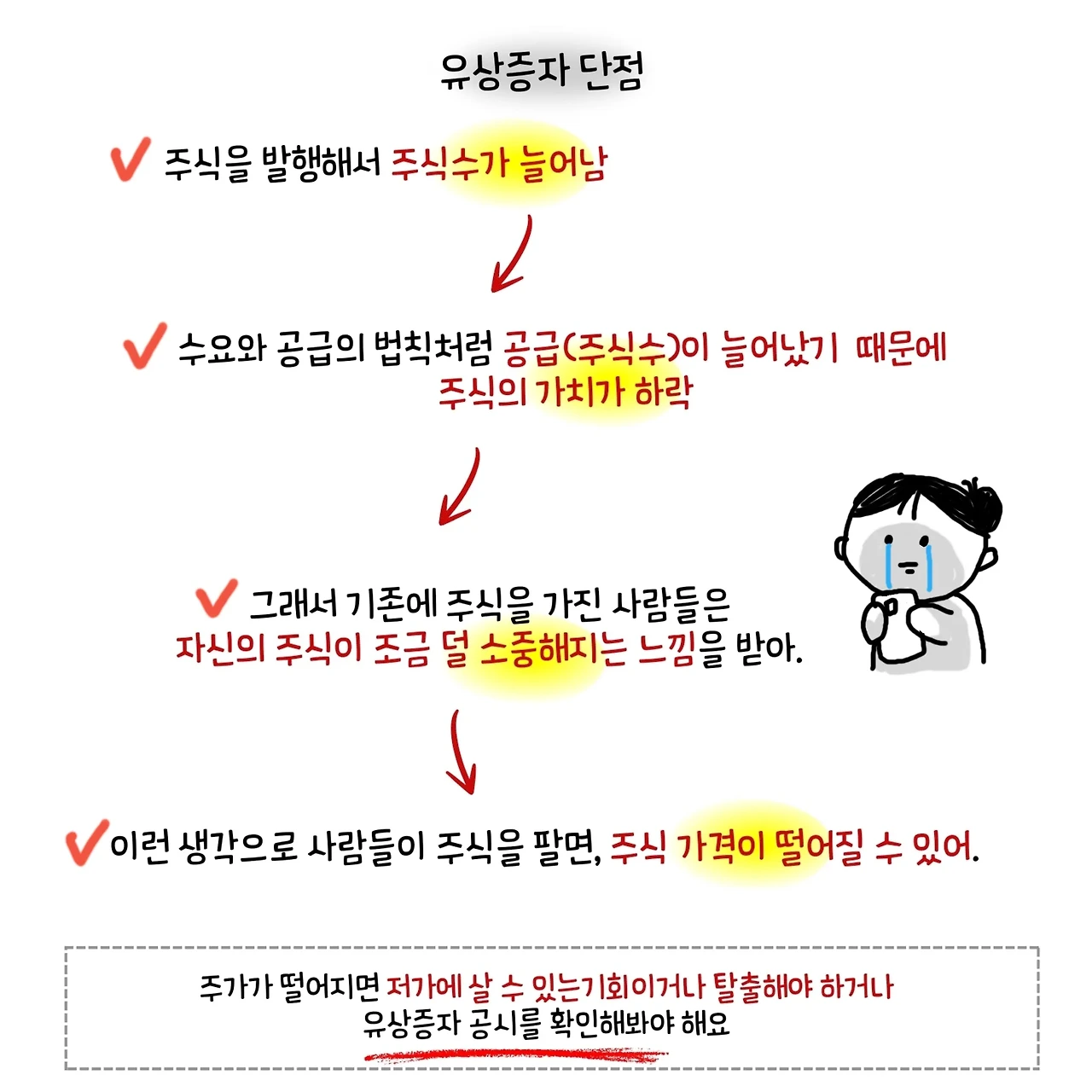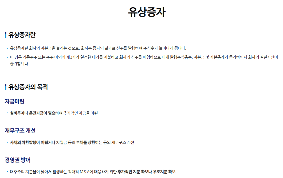 기업 입장에서는 자본을 더 조달할 수 있으니 좋겠지만, 주주 입장에서는 자신이 가진 주식의 가치가 훼손되는 것이니 좋지 않은 일이다.