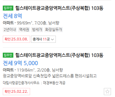 현재 올라와있는 전세는 각 타입별 1개씩인데, 69타입은 8억이라 공급가액을 모두 커버할 수 있고, 84타입은 9.5억이라 아마 엇비슷할 것이다.