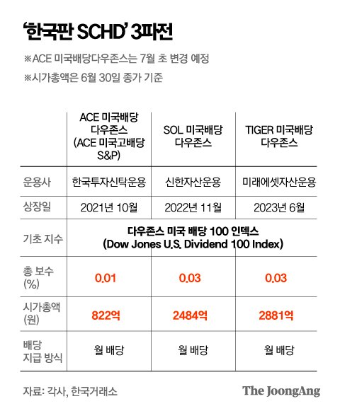 여러 월배당 ETF 중 인기가 높은 상품은 흔히 한국판 SCHD라고 불리우는 것들이다.