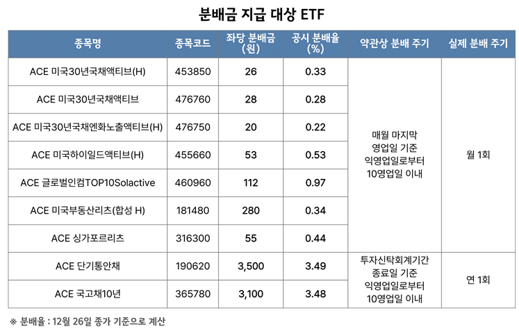 위 예시의 경우 12월 30일이 분배금 지급기준일이고, 그보다 2영업일 이전은 12월 26일이므로 해당 날짜에 ETF 매수가 완료되어야 분배금을 받을 수 있다.