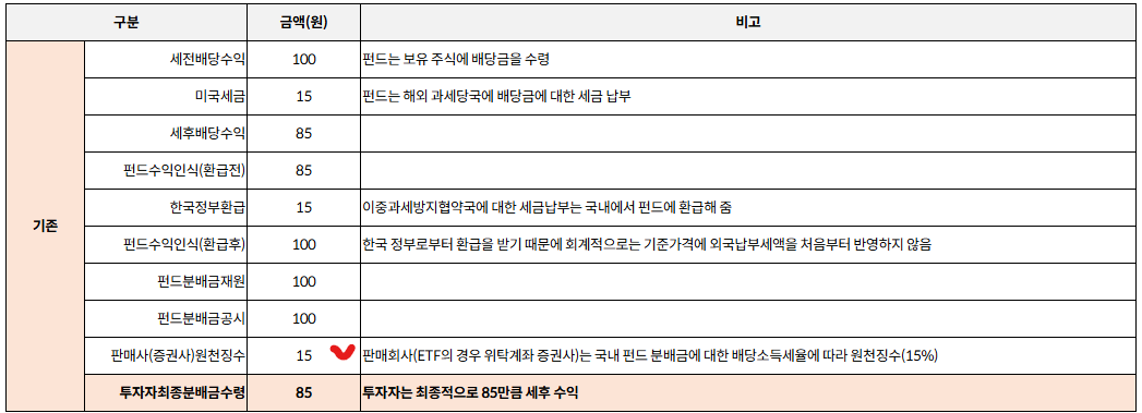 개정 전에는 외국에 납부한 세금(15원)만큼 국세청에서 환급을 해줬고, 이를 다시 판매사에서 원천징수해서 분배금으로 활용한다고 되어있다.