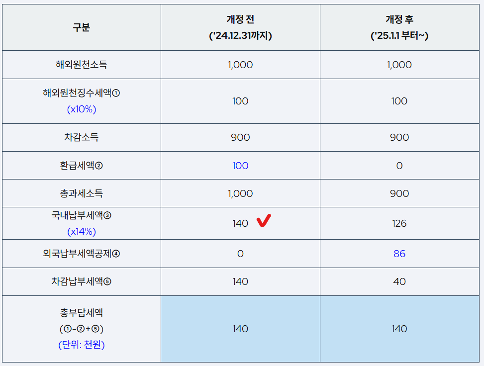 그리고 개정 후에는 외국에 납부한 세금(15원)을 국세청이 환급해주지 않는 대신, 미국에 납부하는 세율(15%)이 우리나라에 납부하는 세율(14%)보다 높으므로 판매사에서 추가 원천징수를 하지 않는다고 되어있다.