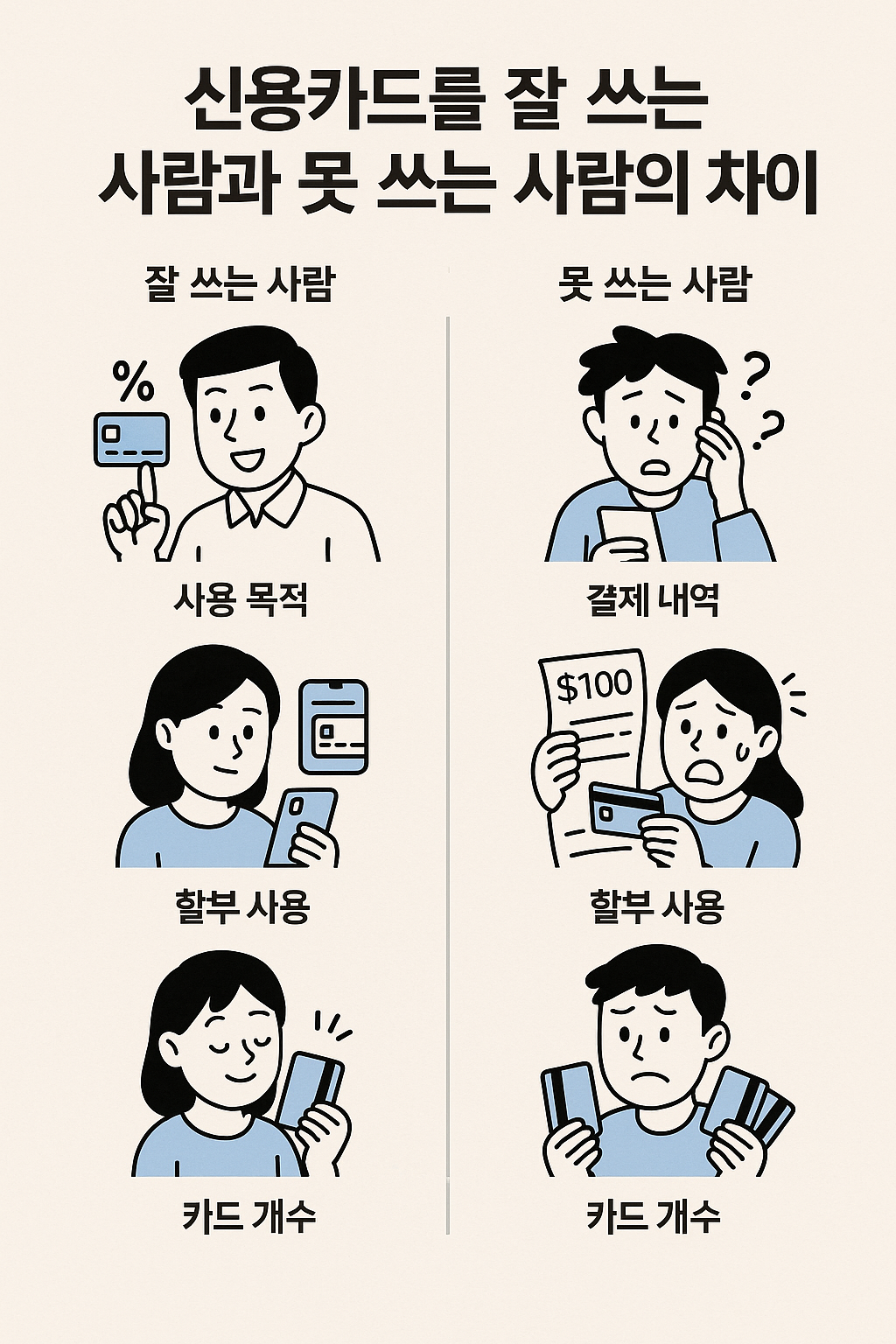 오늘은 신용카드를 잘 쓰는 사람과 그렇지 못한 사람의 차이를 네 가지 기준으로 정리해 봤어요. 혹시 나는 어떤 쪽에 가까운지 점검해 보는 기회가 되었으면 해요.