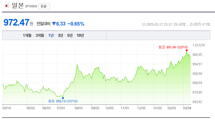 작년에는 800원 중후반이었던 엔화가 어느덧 거의 1000원대를 바라보고 있었다.