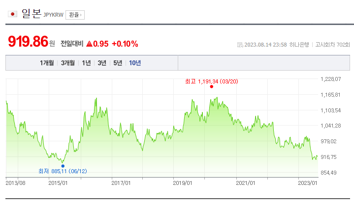 위 그래프는 네이버증권에서 원-엔 환율 그래프를 퍼온 것으로, 최근 10년을 살펴보면 상당한 약세 구간에 진입해있음을 알 수 있다.