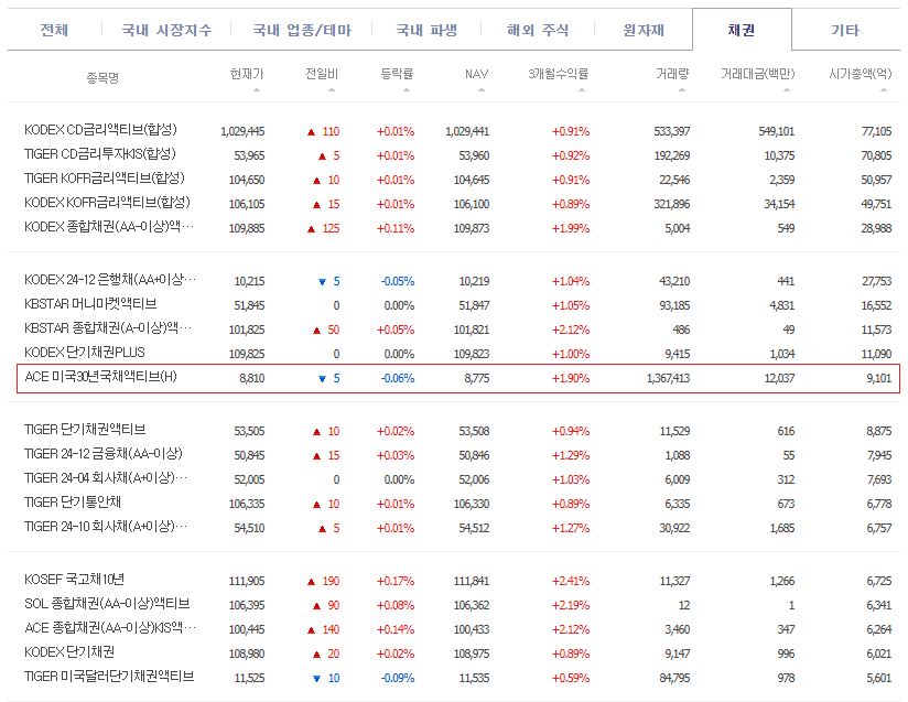 그래서 네이버증권에서 ETF탭 중 채권에서 찾아보려는데, 시가총액 상위권 중 미국 장기채권 ETF 하나가 눈에 띄었다.