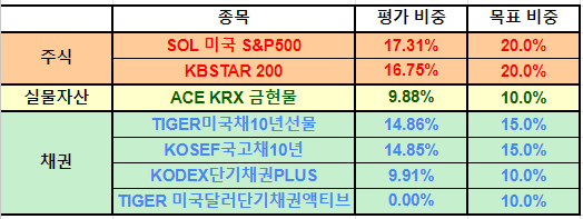 한국단기채의 경우 계속 오를 것이기에 바로 매수를 했고, 그 외의 ETF 중에는 비율을 맞추지 못해 매수가 필요한 부분이 있다.