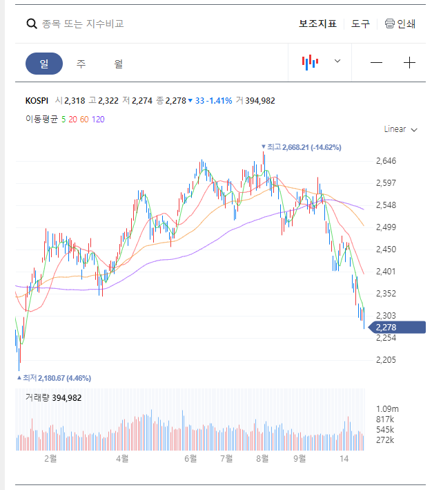 2600대이던 코스피가 언제 2200대로 내려온건지...(출처 : 네이브증권)