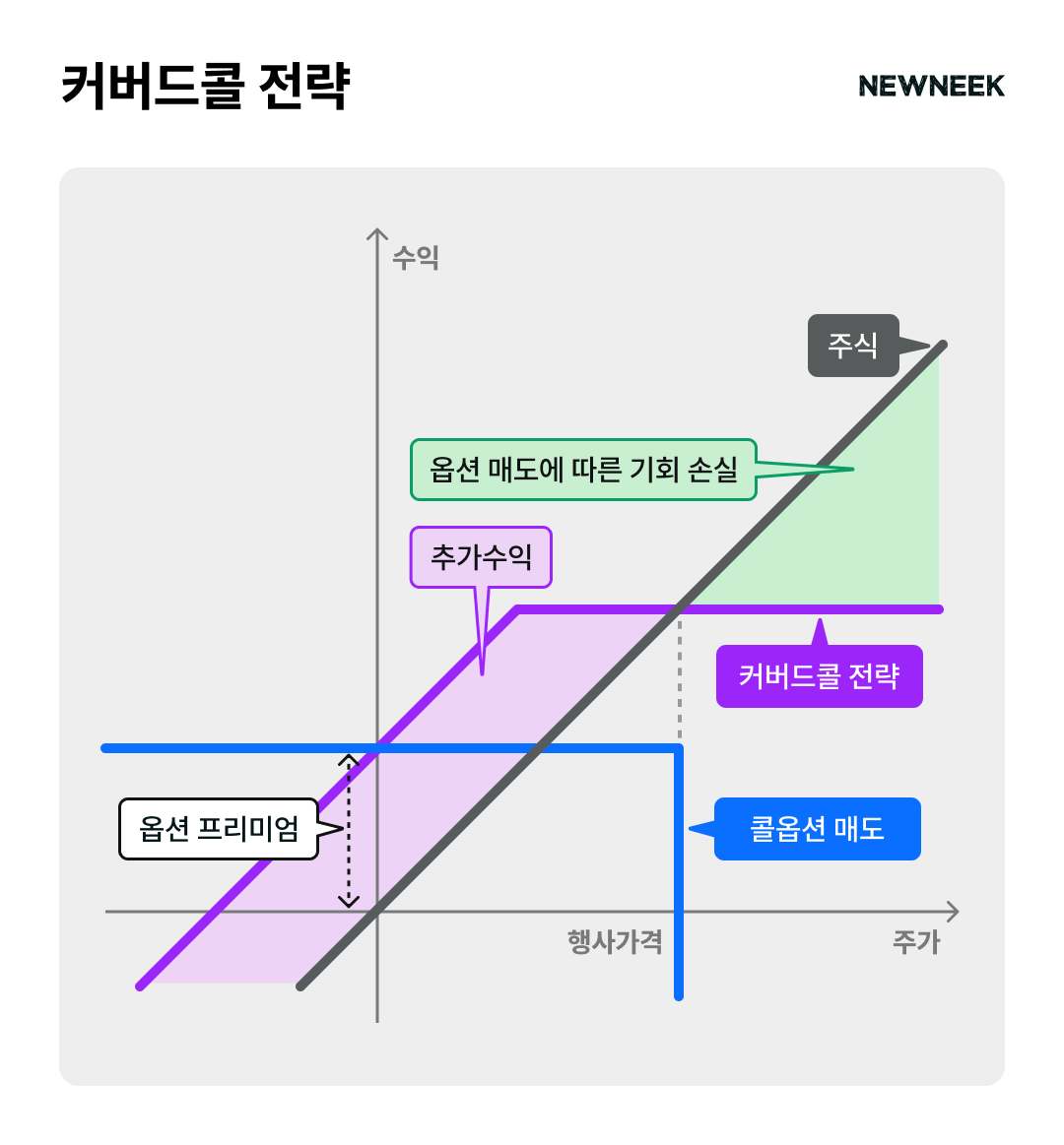 커버드콜은 특정 자산을 보유함과 동시에 해당 자산의 콜옵션(Call Option)을 프리미엄 매도하는 것을 의미
