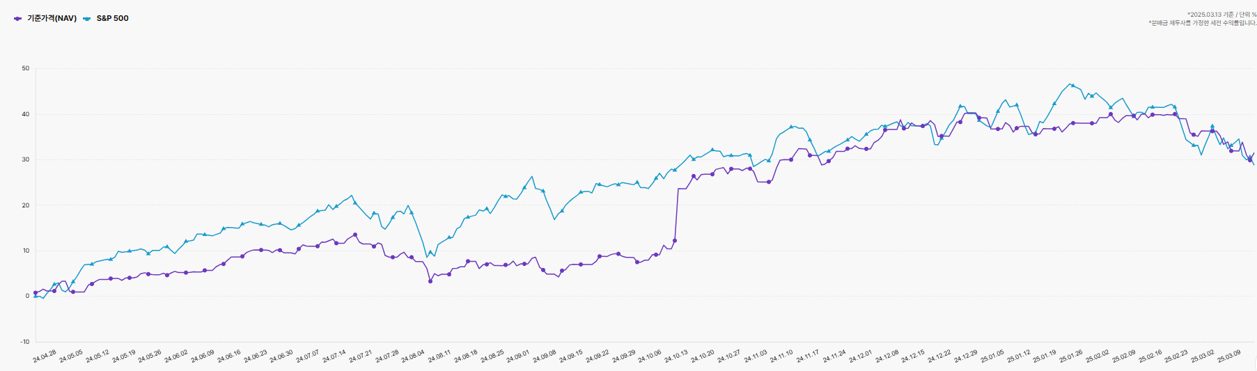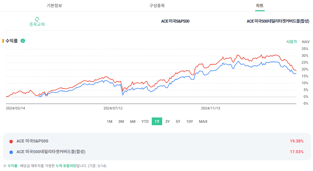 위 그림은 ACE 미국500데일타겟커버드(합성)과 미국 S&P500을 비교한 그래프이다.
