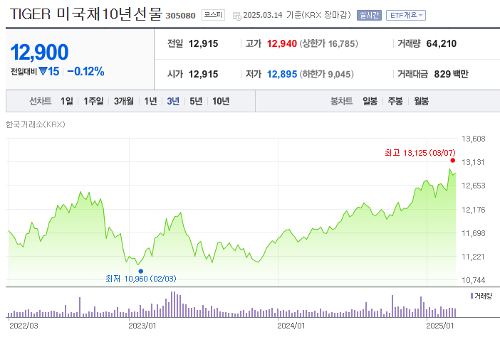대표적으로 TIGER 미국채10년선물의 경우 3년동안 위 그래프처럼 상당히 많이 오른 모습을 보여준다.