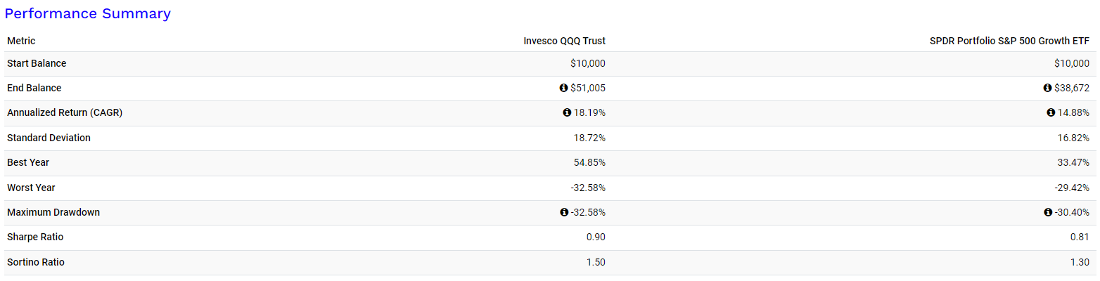 QQQ는 나스닥100 추종 ETF라서 투자 종목 수가 100개이다. 반면 SPYG의 경우 투자 종목 수가 230여개로, 훨씬 더 많은 종목에 투자하고 있다. 이렇게 많은 분산이 수익을 제한하기도 하지만, 반대로 하락을 방어하기도 한다. 그리고 이를 과거 데이터에서도 확인할 수 있다.