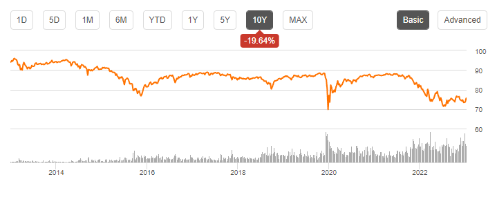 그러나 하이일드 및 회사채의 경우 지난 10년정도를 살펴보니 주가와 배당성장이 대부분 우하향하는 모습을 보여줬다.