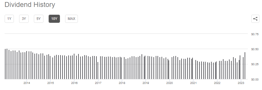 HYG의 10년간 배당 모습(출처 : Seeking Alpha)