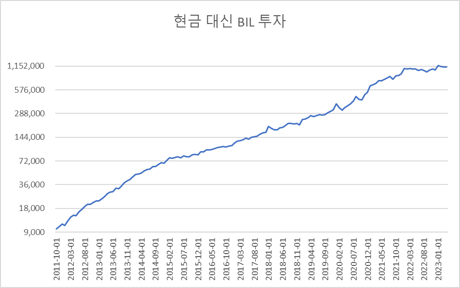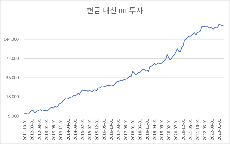 연평균 수익률은 오히려 현금이 근소하게 앞서고, MDD는 BIL이 조금이나마 낫다.
