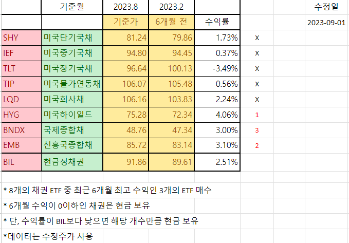 매수 : HYG(75.06), EMB(85.29), BNDX(48.59)