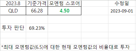 모멘텀 점수가 4.5가 나왔으니 6.5로 나눠서 총 투자금액의 약 70%정도를 전부 QLD에 투자했다.