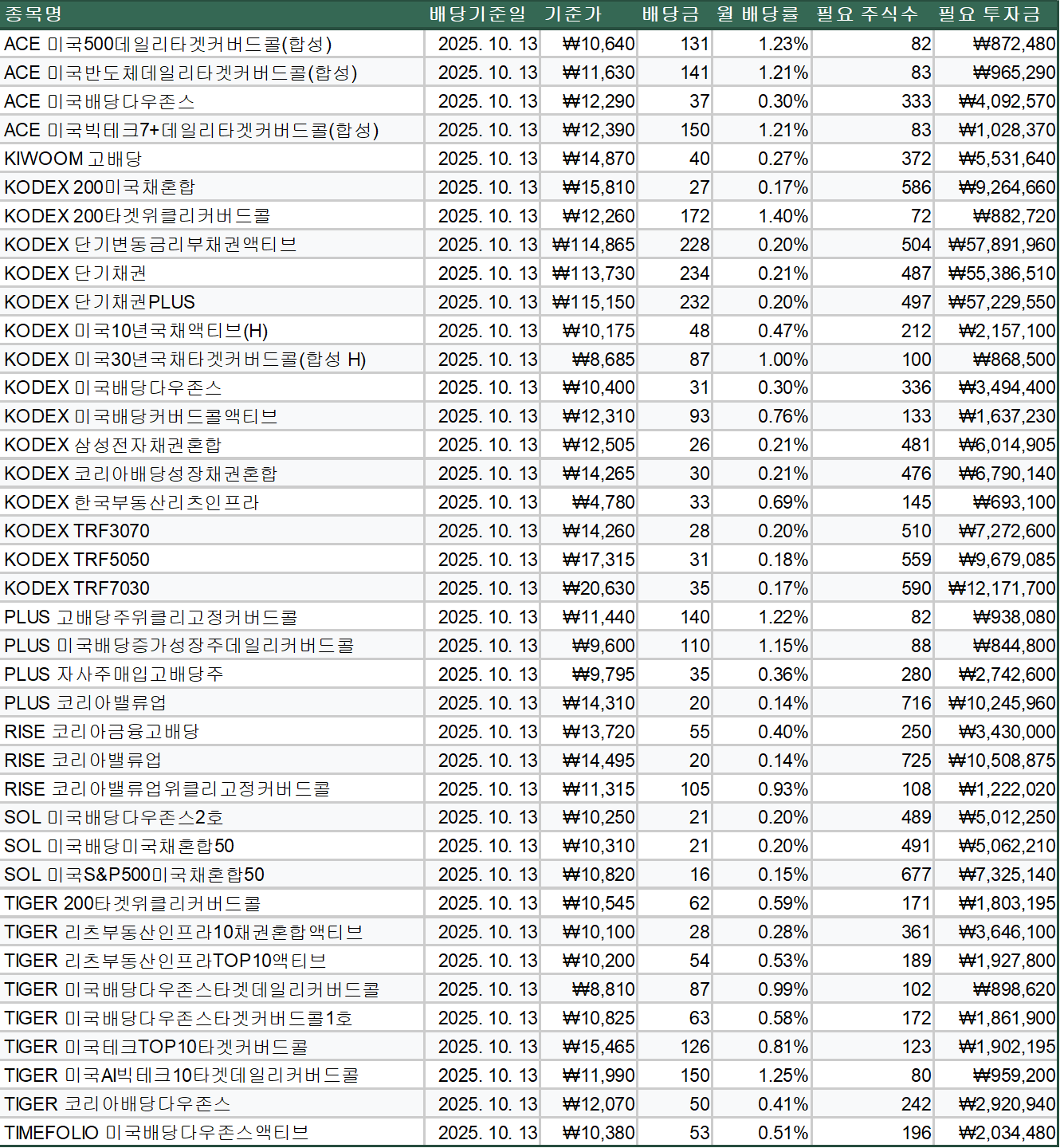 25년 10월 중 월배당ETF 분배금 내역