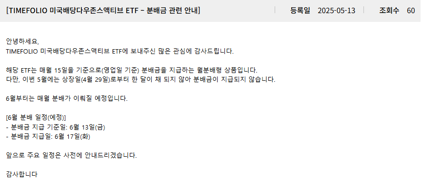 이번에 TIMEFOLIO 미국배당다우존스액티브의 분배금은 없었는데, 상장된지 얼마 안돼서 지급되지 않는다고 공시했다.