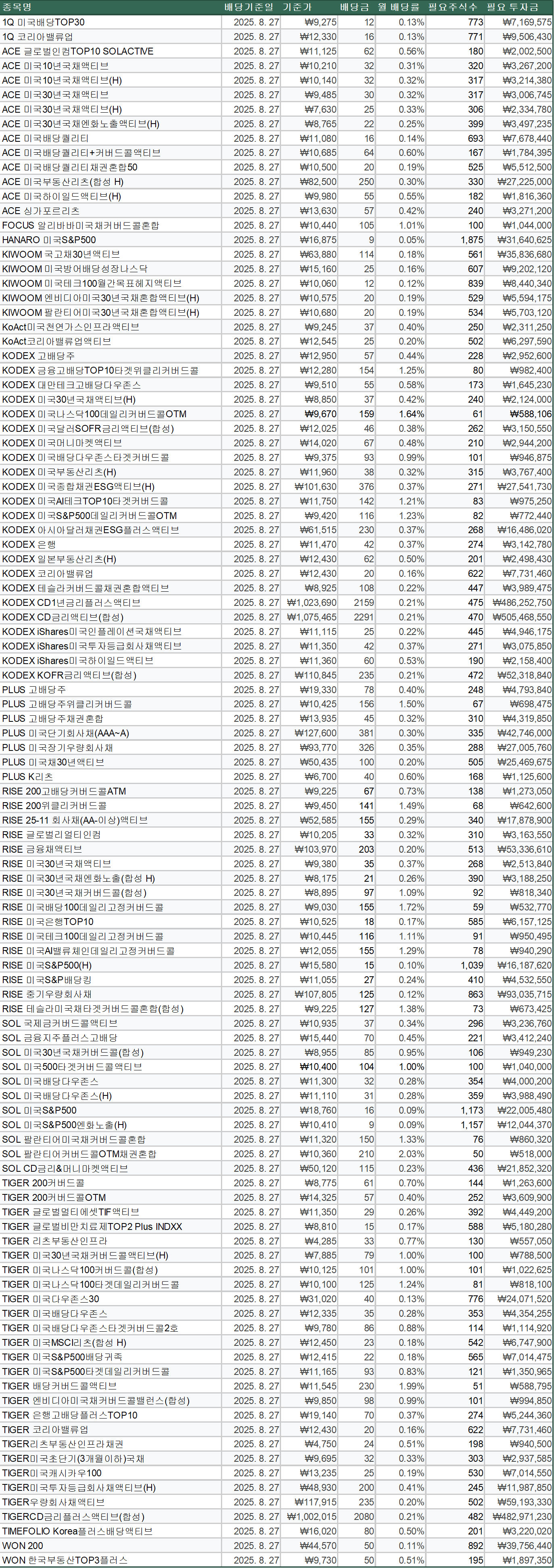 25년 8월 말 월배당ETF 분배금 내역