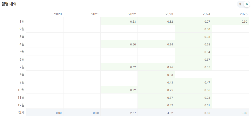 공시 분배율이 0.3%였으니 연으로 환산하면 3.6%인데, 이는 평균적인 SCHD의 배당률에 해당하니 괜찮았던 것이다.