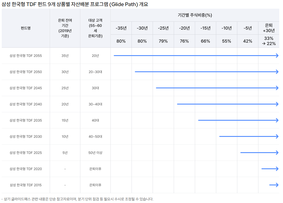 참고로 TDF란 Target Date Fund의 약자로 어떠한 시점에 은퇴를 한다는 목표로 자산배분을 자동으로 조절하는 상품이다.