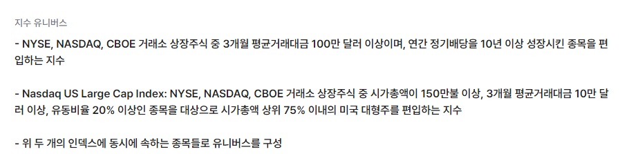 어쨌든 10년 이상 배당성장을 이루면서 시가총액 상위 75% 이내의 미국 대형주를 지수로 편입한다는 뜻이다.