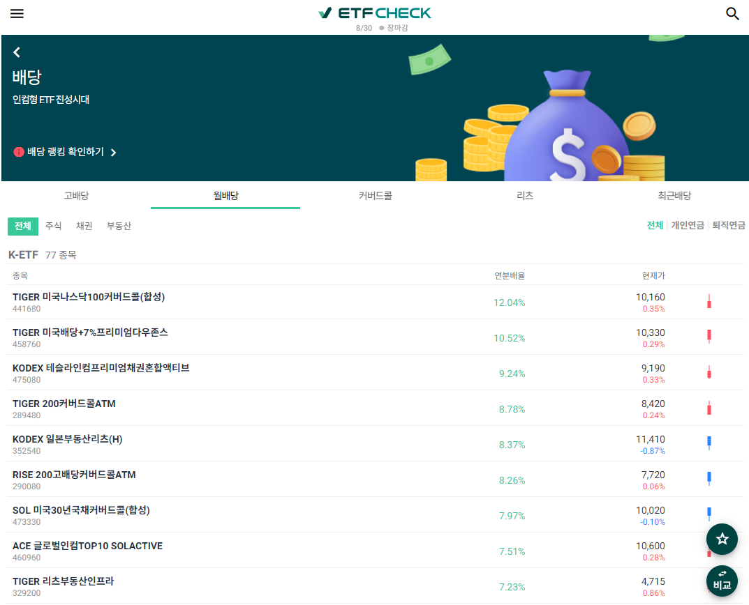 국내상장 월배당ETF가 잘 정리되어 있다.(출처: ETFCheck)