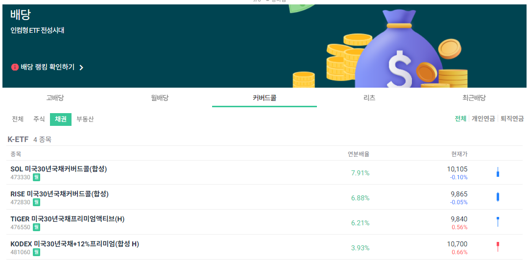 그래서 간략하게 채권형 커버드콜 ETF를 몇 개 찾아서 정리하려고 한다.