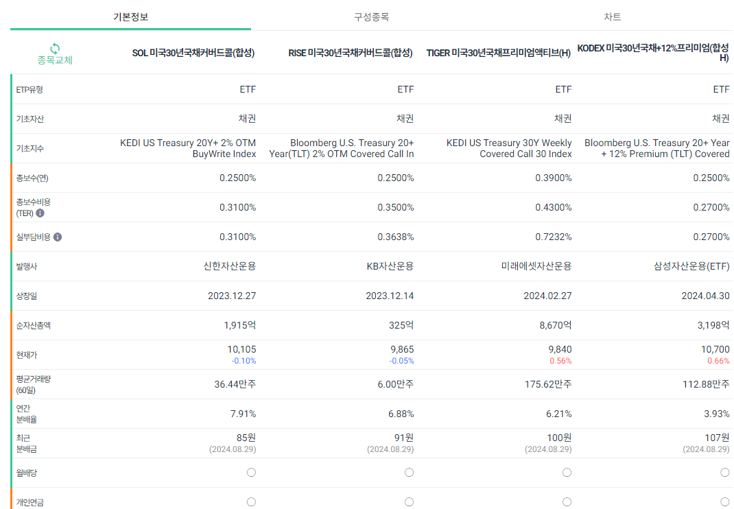 채권 ETF는 월분배 상품이 이미 많이 있다. 그런데 대부분 미국 30년의 초장기 채권이나 미국 하이일드 채권에 투자하는 상품이라서 혹시 다른 상품에 투자하는 게 있나 살펴보려고 커버드콜을 알아본 것이었다. 하지만 이렇게 보니 커버드콜 역시 30년물 채권에만 투자하고 있음을 알 수 있었다. 이럴거면 그냥 기초지수형(?)에 투자하는게 나한테는 맞는 것 같다.