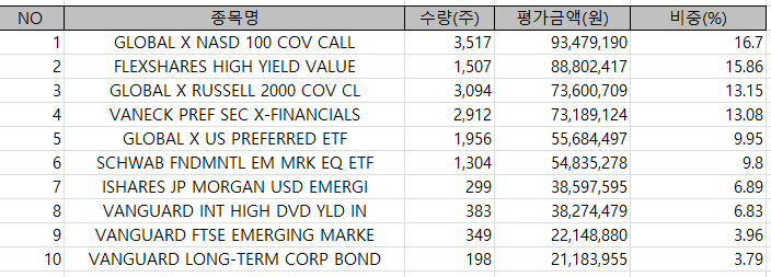 그 뒤로 보이는 ETF도 보면 커버드콜, 우선주, 이머징국가 채권 등 다양한 종류의 ETF가 분포되어 있었다.