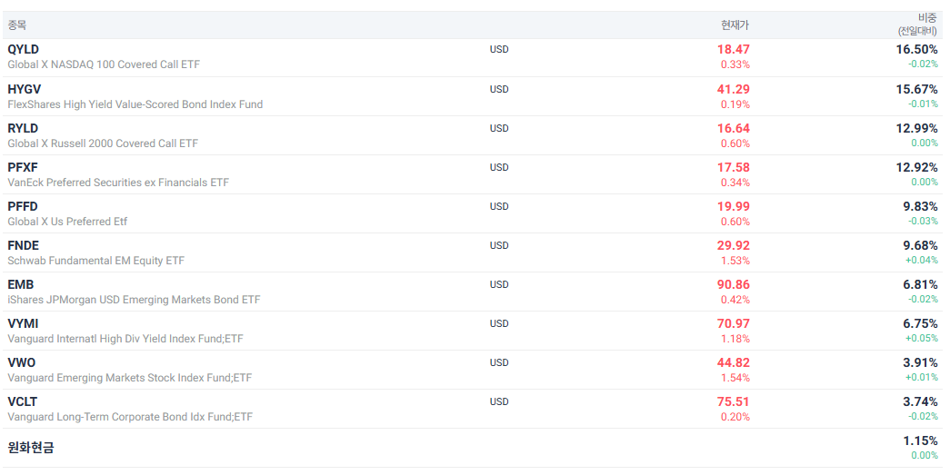 일단 가장 높은 비중은 QYLD와 HYGV이다.