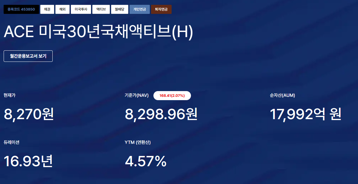 여러 미국30년물 ETF 중 압도적인 시가총액을 자랑하는 ETF가 있으니, 글의 주제인 ACE 미국30년국채액티브(H)이다.
