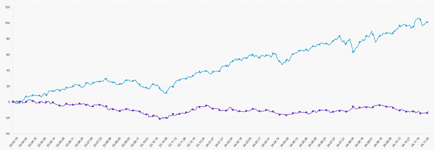 참고로 나는 이 상품이 아닌 환노출 ETF를 IRP에 담고 있고, 이것과 비슷한 ETF를 ISA에 담고 있는데 처음에는 살짝 수익권이더니 트럼프 당선 이후 큰 손실 구간으로 빠져버렸다.