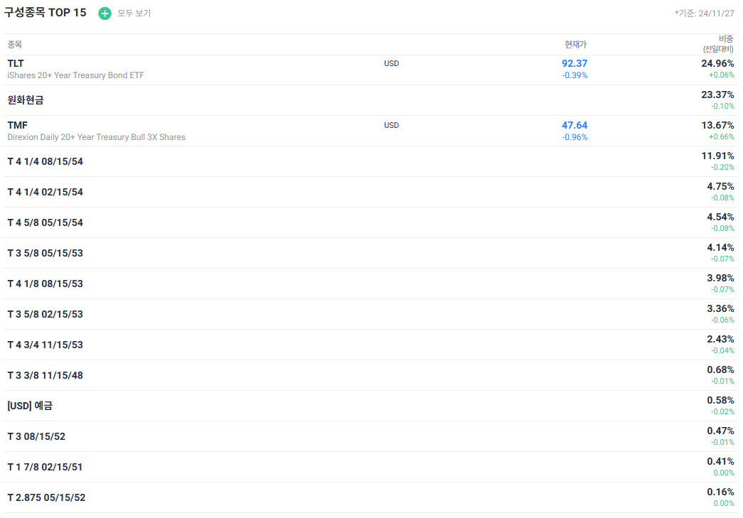 그래서 구성종목을 살펴보면 미국 장기채권뿐만 아니라, 미국에 상장되어 있는 장기채권 ETF도 담고 있음을 알 수 있다.