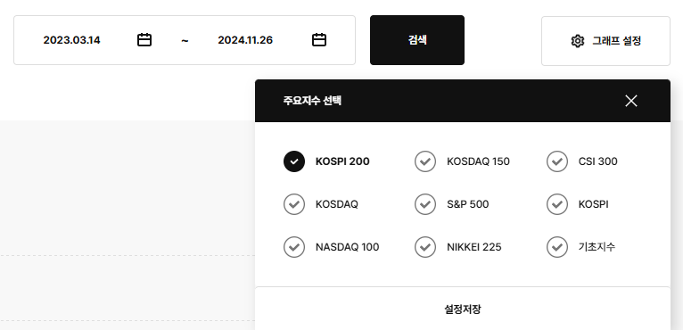 수익률 그래프의 설정 부분에서, 주요 지수와 비교하는 부분이 있었다. 이를 통해서 다른 기초지수 대비 해당 ETF의 수익률이 어땠는지 확인할 수 있었다.