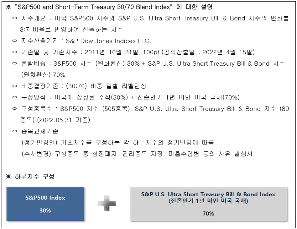 기초지수 이름에도 나와있다시피 이 기초지수는 미국 S&P500과 단기채권에 각각 30%, 70%씩 투자하는 상품이다.