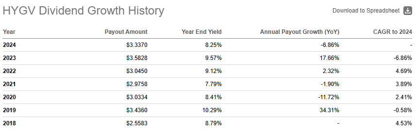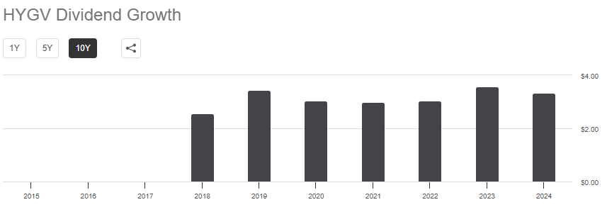 그리고 배당형 ETF이다 보니 배당률도 확인하는데, 배당률도 HYGV가 더 좋다.