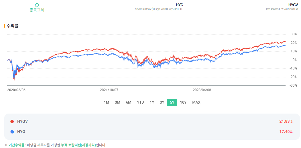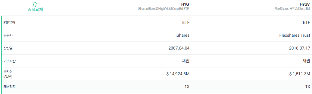 운용규모와 운용년수는 HYG가 압도적인데, 수수료는 HYGV가 더 낫다.