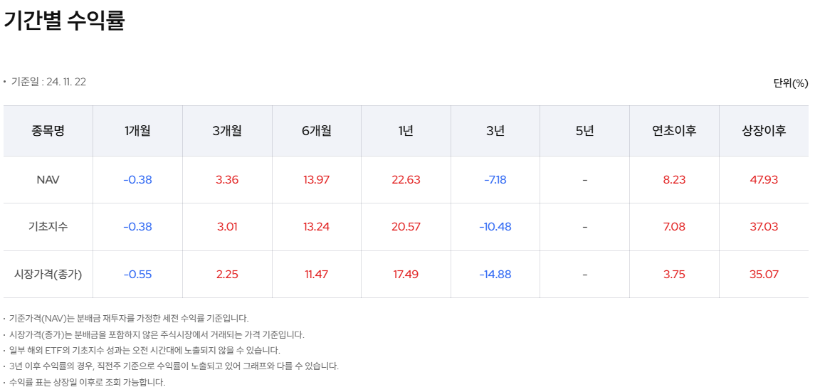 기간별로 차이가 있긴 한데, 전체적으로 TIGER 상품이 수익률은 좋은 편이었다.