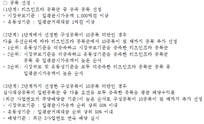 만일 구성종목이 10종목 미만일 경우 코스닥에 상장된 종목도 추가할 수 있다고 되어있다.