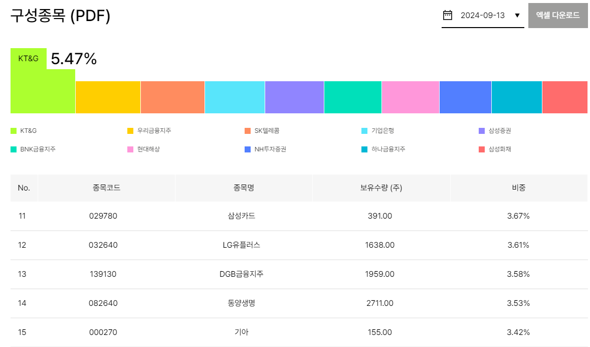 여긴 홈페이지 디자인을 좀 이상하게 해서 직관적이지는 않은데... 어쨌든 상위 15개까지 캡처하면 위와 같다. 아무래도 배당금을 높게 하기 위해서 금융과 보험의 비중이 높을 수 밖에 없다. 그런데 비중 1위는 KT&G다. 역시 우리나라의 대표적인 고배당주 하면 빼놓을 수가 없지... 나도 투자했던 회사인데 배당금이 진짜 상당하다. 1년에 1번 배당하는게 문제지만... 홈페이지의 구성종목 파일을 다운받아서 보면 이외에도 에너지, 유틸리티, 자동차 등 몇몇 종목이 편입되어 있음을 알 수 있다. 음... 그냥 사실상 금융주라고 봐도 무방할듯한 포트폴리오지만...?
