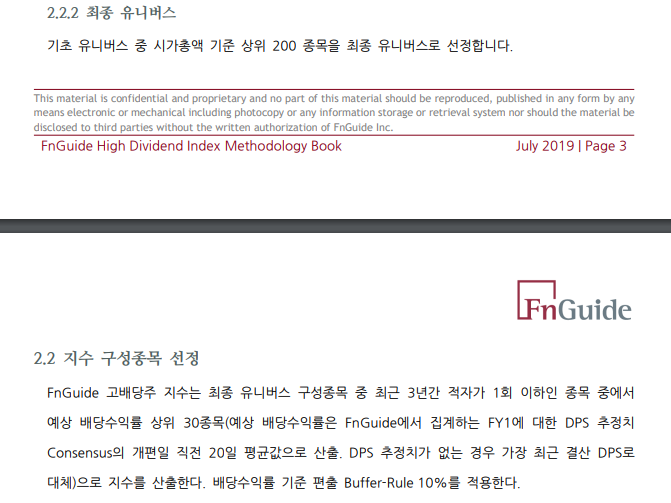 앞선 방식으로 200개의 종목을 선정한 이후, 최근 3년간 적자가 1회 이하인 종목 중 예상 배당수익률 상위 30 종목을 산출한다고 한다. 예상 배당률은... 음... 복잡하니 모르겠다. 어쨌든 운용사가 자체적으로 판단하는게 아니라 나름의 데이터가 있다는 것 같다. 나중에 궁금하면 한 번 찾아보면 좋을 듯?