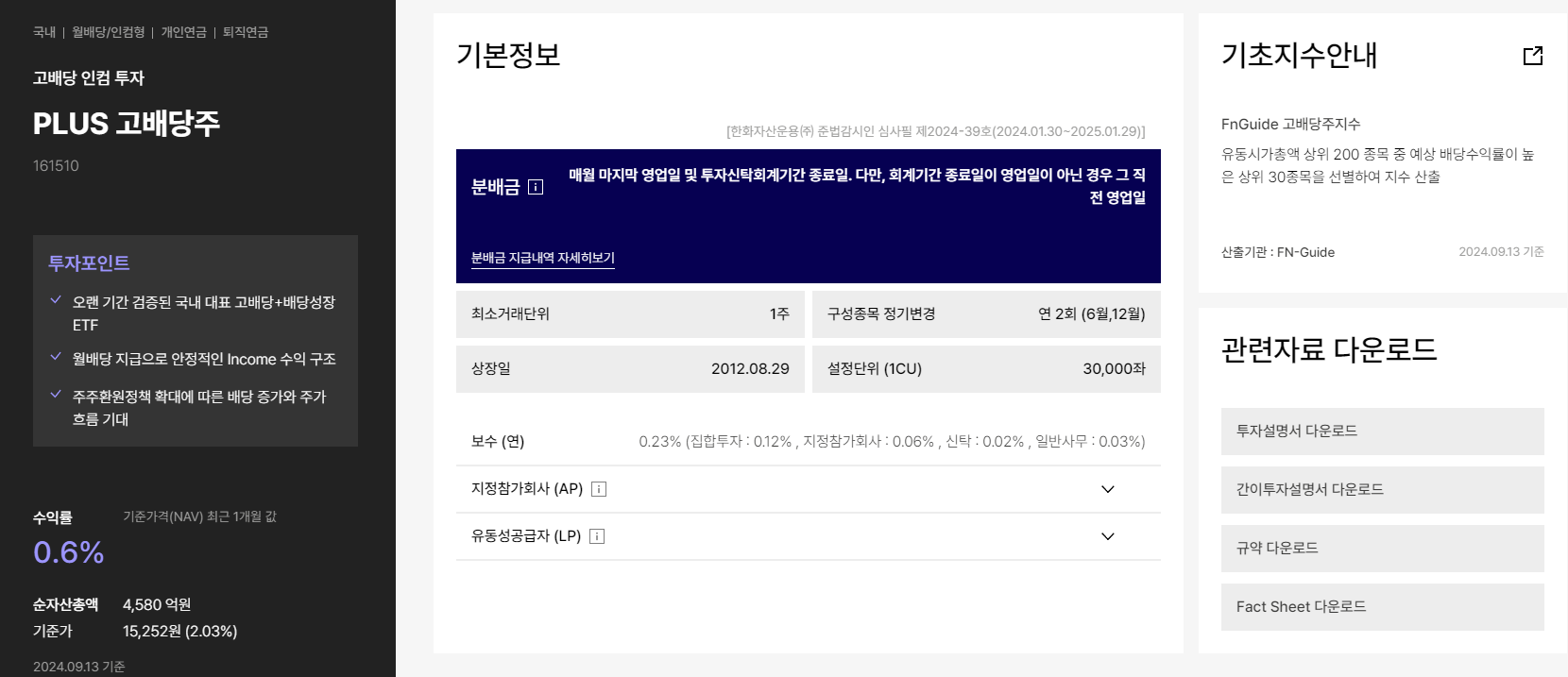 PLUS ETF는 한화자산운용이 운용하던 ARIRANG ETF의 새로운 브랜드명이다. 그래서 원래 ETF의 이름도 ARIRANG 고배당주였는데, ETF 브랜드를 따라 올해 7월 이름을 바꿨다. 한화자산운용도 대박 ETF는 없는 걸로 아는데... 이 상품이 대박 상품일듯 싶다.
