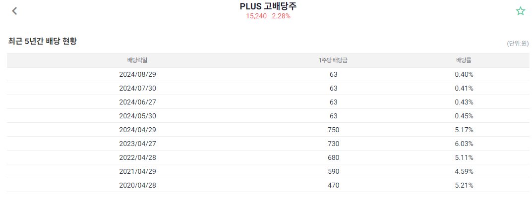 배당추이를 보면... 원래 이 상품은 1년에 1회 배당하는 상품이었다. 간혹 추가로 들어올 때도 있던데 그래봐야 10원(...)이었다. 이러니 배당 투자할 맛이 안 나던 ETF였는데, 올해 5월부터 연분배로 바꿔서 지급하고 있다. 배당금도 보니 일단은 등락없이 동일하게 주고 있다. 삭감없이 꾸준히만 잘 주면 상당히 좋을 것 같다. 배당률도 4% 중후반에서 높으면 6%까지 기대할 수 있어 배당투자에 꽤 쏠쏠한 상품인 것은 확실하다.