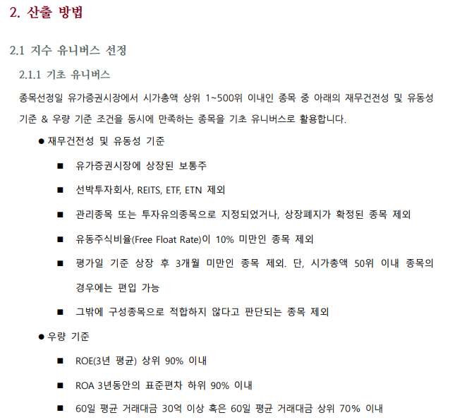 이것저것 설명이 많은데, 결국 재무적으로 건전하고 유동성이 풍부하면서, ROE와 거래대금 등 우량한 회사의 주식을 기초로 먼저 투자종목을 선정한다는 것이다.