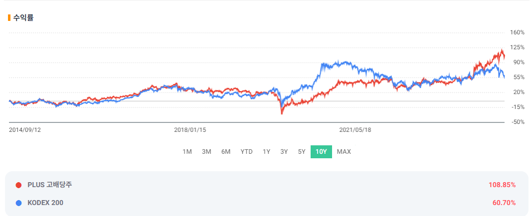 그리고 우리나라 대표 지수인 코스피200에 투자하는 상품과 비교해보면, 2020년까지는 주가 흐름이 거의 비슷했다. 그러다 2020년 초반에는 코스피가 쭉쭉 오름에도 이 상품은 별 힘을 쓰지 못했는데, 어느순간 역전을 해버렸다. 최근 수익률은 고배당주가 상당히 좋다. 이러면... 코스피는 그저... 눈물만...