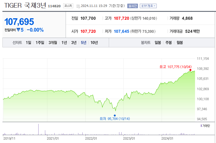 채권 ETF 중 하나인 TIGER 국채3년을 찾아보니 그래프가 얼추 반비례의 움직임을 보여주고 있다.